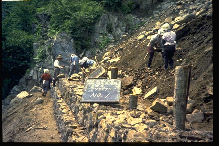 フトン篭土留工.フトン篭据付け詰石作業